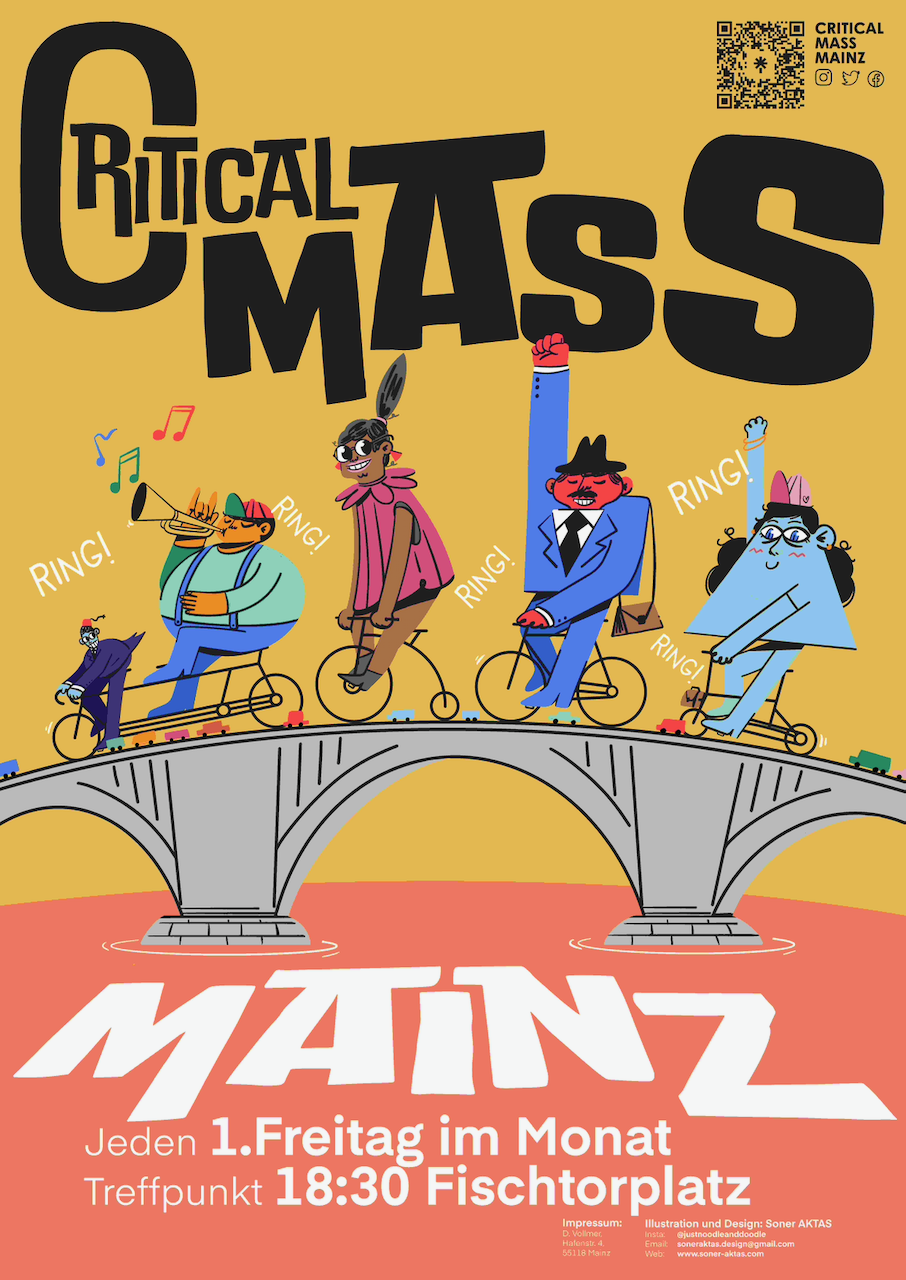 Jeden ersten Freitag im Monat startet der Fahrradkorso ‚Critical Mass Mainz‘ um 18:30 Uhr am Fischtorplatz