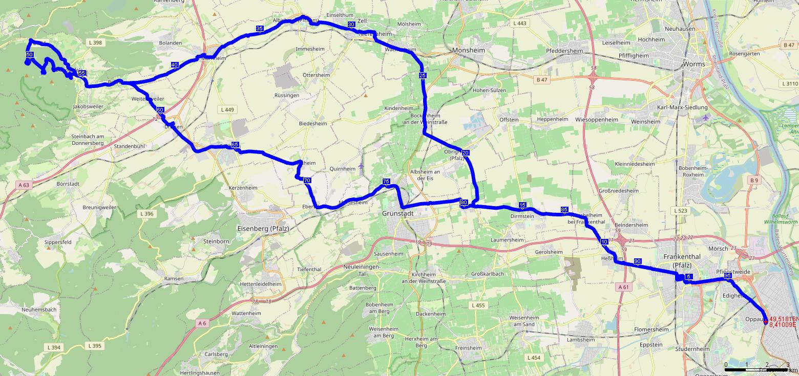 Der Donnersberg ist mit 685 m der höchste Berg der Pfalz und damit etwa 10 m höher als die Kalmit im Süden. Man kann ganz gut mit dem Rad dorthin fahren. Die Pfrimm entlang bis Marnheim ist noch relativ einfach, aber die Anstiege bis zum Donnersberg (Einkehrmöglichkeit Keltenhütte) sind teilweise knackig. Über Dannenfels und Göllheim führt die Tour wieder zurück nach Ludwigshafen.