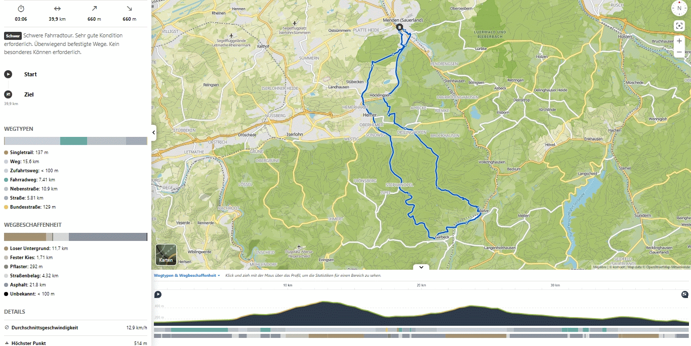 | 40 km | 13 km/h | fester Belag | bergig | 660 m |