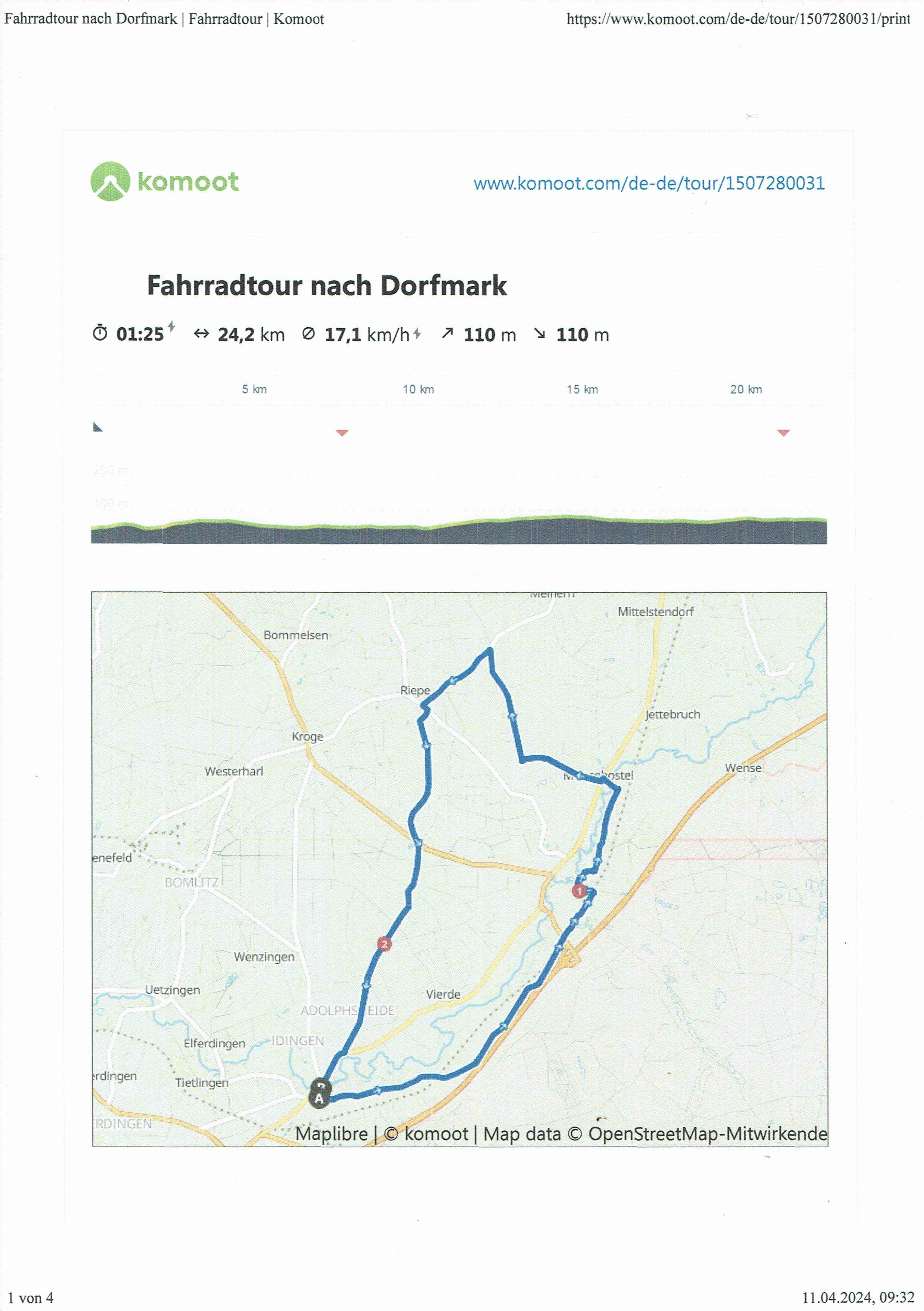 Feierabendradtour zum Stadtradeln ab Rathausplatz in Bad Fallingbostel nach Dorfmark. Zurück über Mengebostel und Riepe nach Bad Fallingbostel.