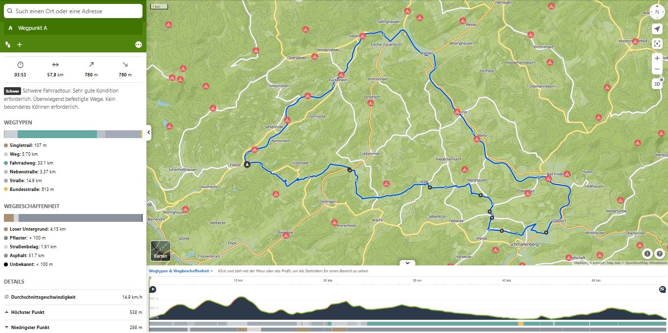 Die Strecke wird ca. 59 km betragen, davon 33 km Fahrradweg, sie ist überwiegend asphaltiert, aber auch kurze Wald- und Wirtschaftswege werden befahren. 780 Höhenmeter werden insgesamt rauf und runter gefahren.. Bis Wormbach kann es mal steil angehen, danach gibt es nur noch moderate Steigungen.