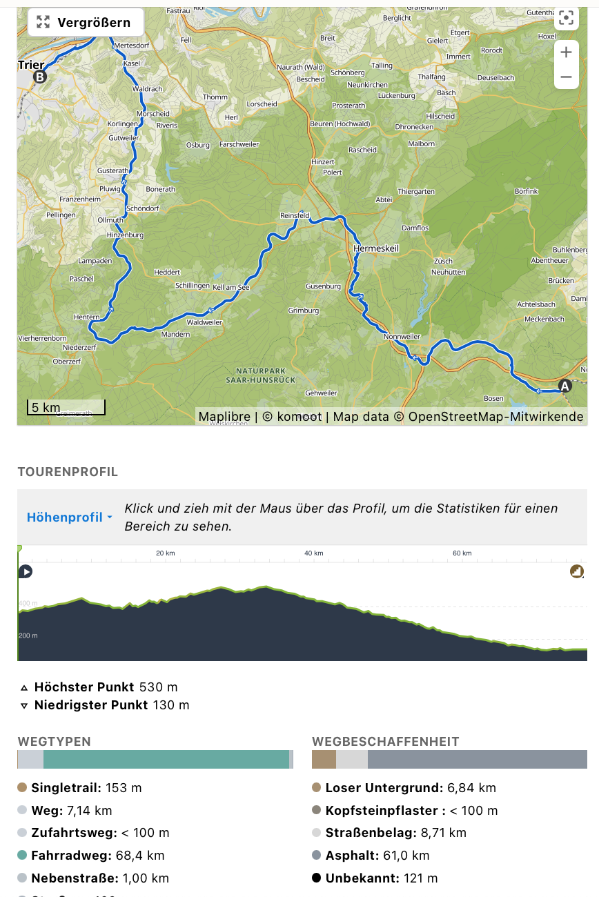 Dort folgen wir dem ganz neu fertiggestellten Radweg des St. Wendeler Landes auf der ehemaligen Bahntrasse über den Hunsrück über Nonnweiler-Bierfeld, Hermeskeil, Kell bis ins Moseltal nach Ruwer. Danach geht es an der Mosel entlang die letzten Kilometer nach Trier.