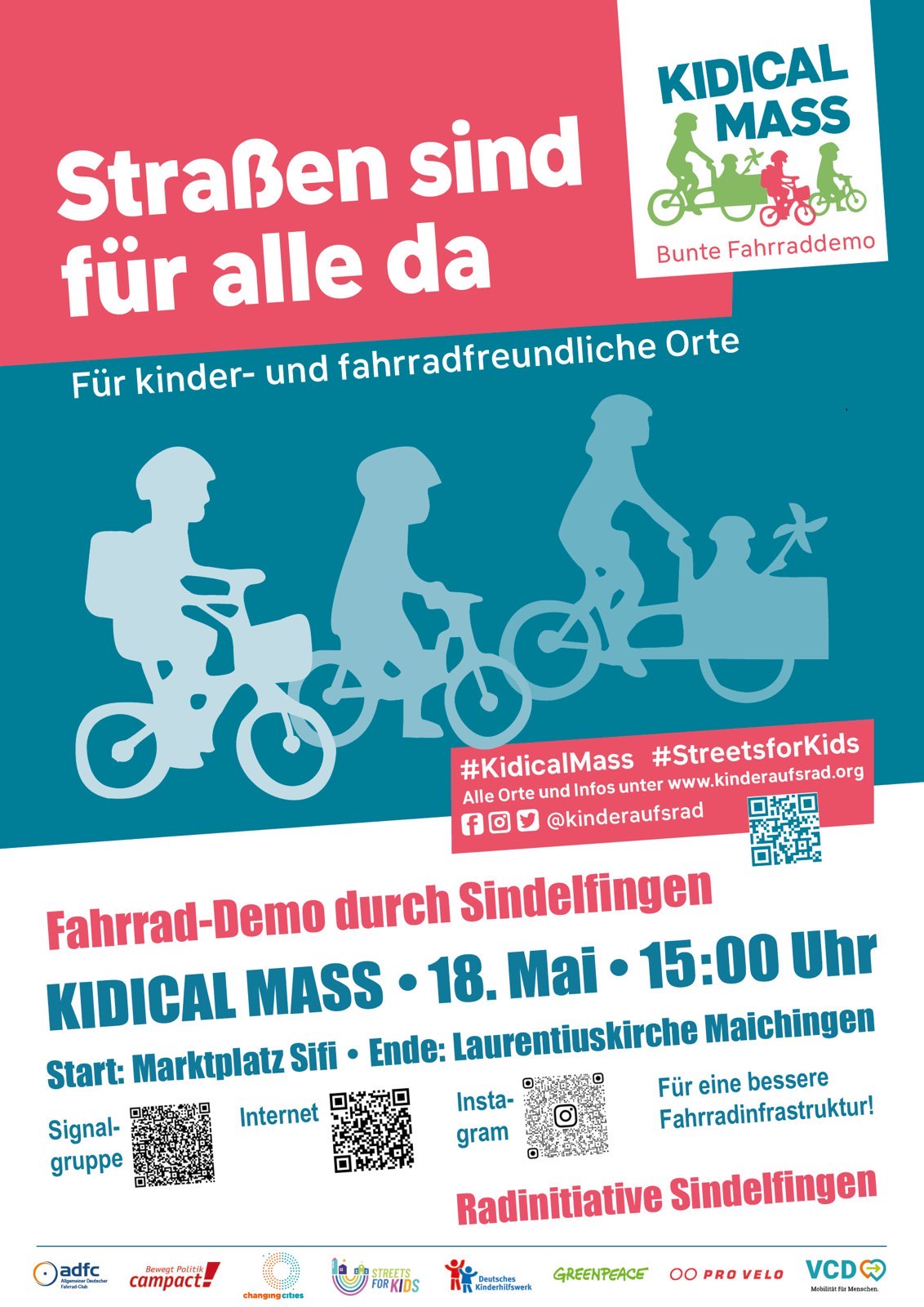 Auch Kinder und ihre Familien haben ein Recht auf selbstbestimmte, sichere, barrierefreie und effiziente Mobilität ohne Auto. Um zu zeigen, dass man nicht allein ist und um sich auch in Sindelfingen sichtbar zu machen, findet am Sonntag, 18. Mai 2025 unsere dritte Sindelfinger Kidical Mass statt. Wir starten um 15:00 Uhr am Marktplatz.