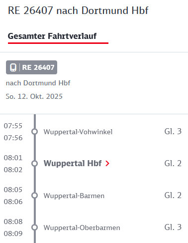 Mit dem RE4 bis Dortmund-Hbf. Der Zustieg kann frei gewählt werden, z. B. um 08:02 in W-Hbf.