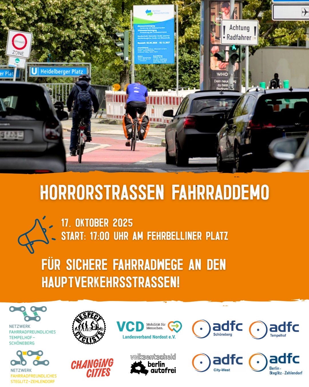 Am Freitag, den 17. Oktober 2025 findet unsere 2. Fahrraddemo "Schluss mit Horrorstraßen!" für den Umbau gefährlicher Straßen statt. Wir starten um 17 Uhr am Fehrbelliner Platz, kommt einfach dazu!