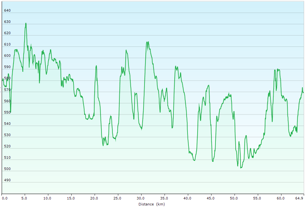 | 65 km | 22 km/h | unbefestigte Wege | hügelig | 970 m |