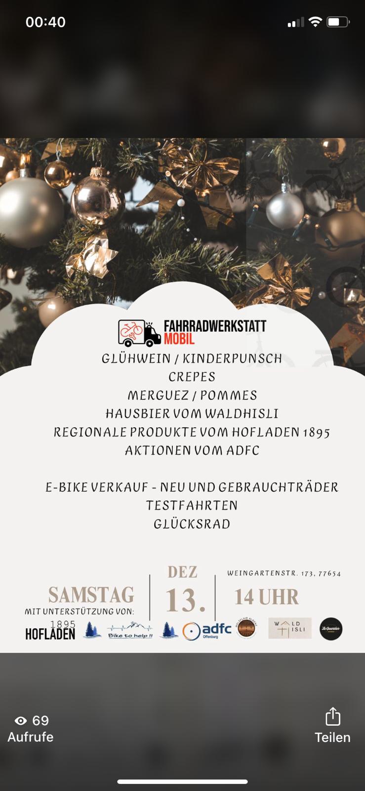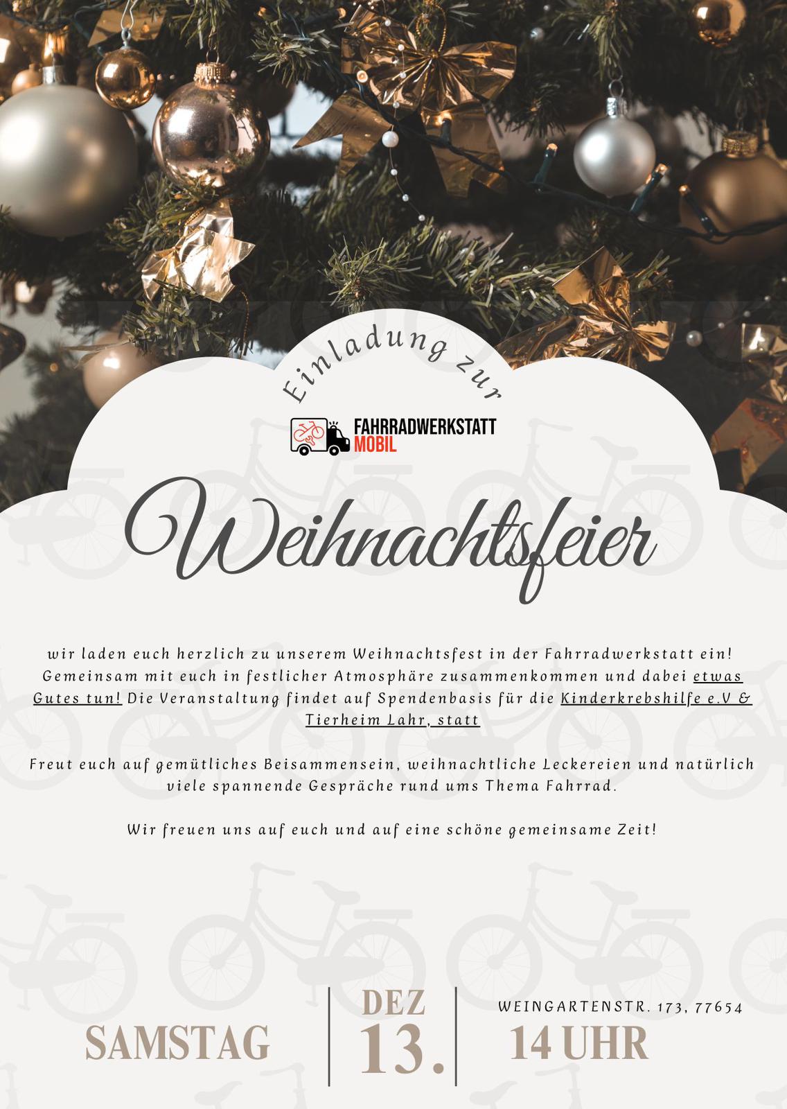 Die mobile Fahrradwerkstatt lädt zu einer kleinen Weihnachtsfeier ein und wir sind mit unserem Glücksrad und Infos rund ums Rad dabei.