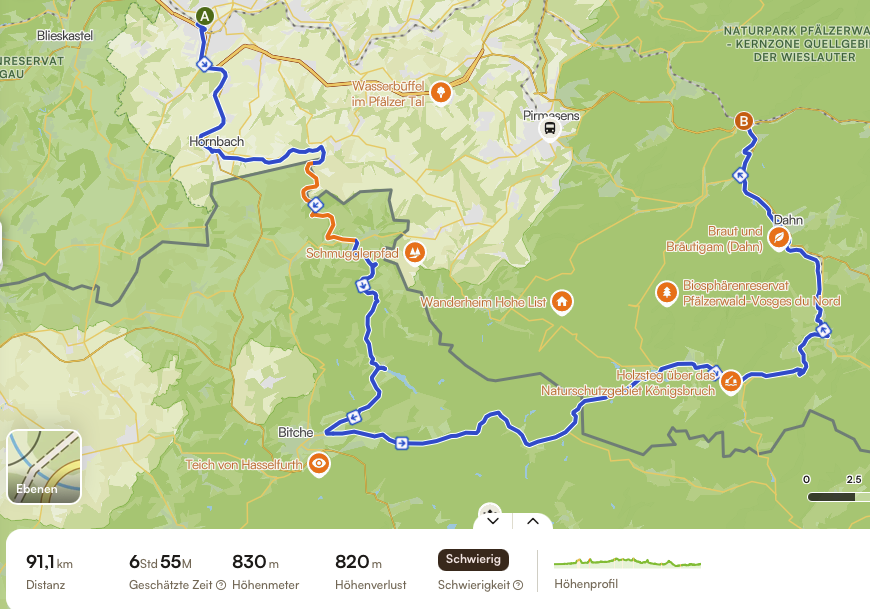 Wir starten in Zweibrücken, folgen dem Hornbachweg auf der alten Bahntrasse nach Hornbach, anschließend fahren wir weitestgehend parallel zum Hornbach bis zum Fuße von Riedelberg, ehe wir das Zollhäuschen und die Grenze nach Frankreich passieren. Wir durchqueren Rolbing, Dorst und Waldhouse auf schwach befahrenen aber gut ausgebauten Straßen, bis wir auf den noch relativ neuen Radweg zwischen Walschbronn und Bitsch stoßen. Auf dem bleiben wir nur ein paar Kilometer, dann verlassen wir das Tal der la Horn (das Tal, das Bitsch mit Walschbronn verbindet), und nehmen Kurs auf Haspelschiedt. Dort besteht die Möglichkeit, am Haspelschiedter Weiher eine Picknickpause einzulegen.