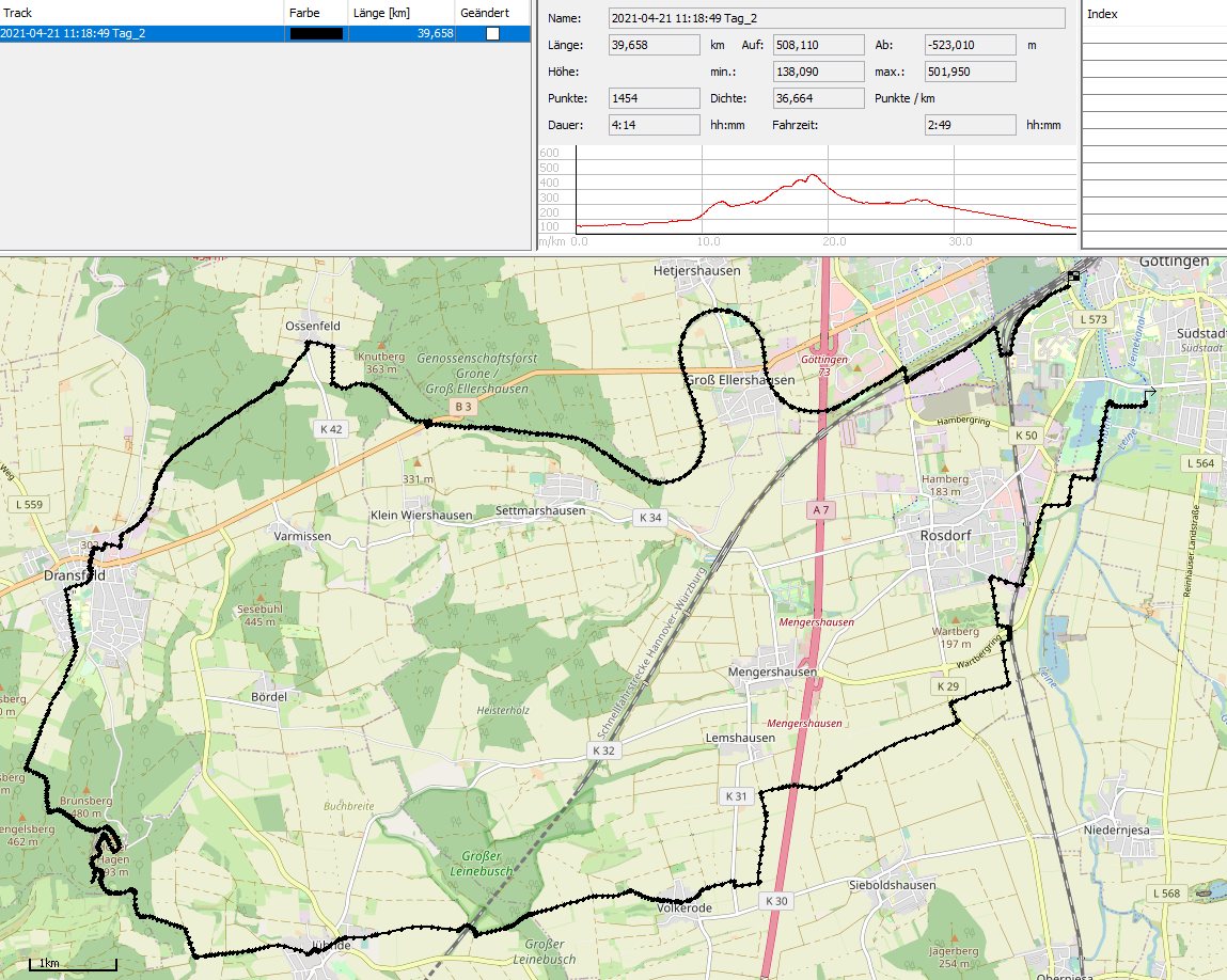 Der Beginn folgt im Wesentlichen dem Weser-Harz-Heide-Radweg. Sanft mit 1,6 % Steigung über die Autobahn um Groß Ellershausen herum. Nach etwa 10 km überqueren wir die B3. Auf der anderen Seite geht es auf einem Waldweg bergan nach Ossenfeld und wieder zurück auf die „Dransfelder Rampe“. Über das Werksgelände einer Asphaltrecycling-Firma erreichen wir Dransfeld,