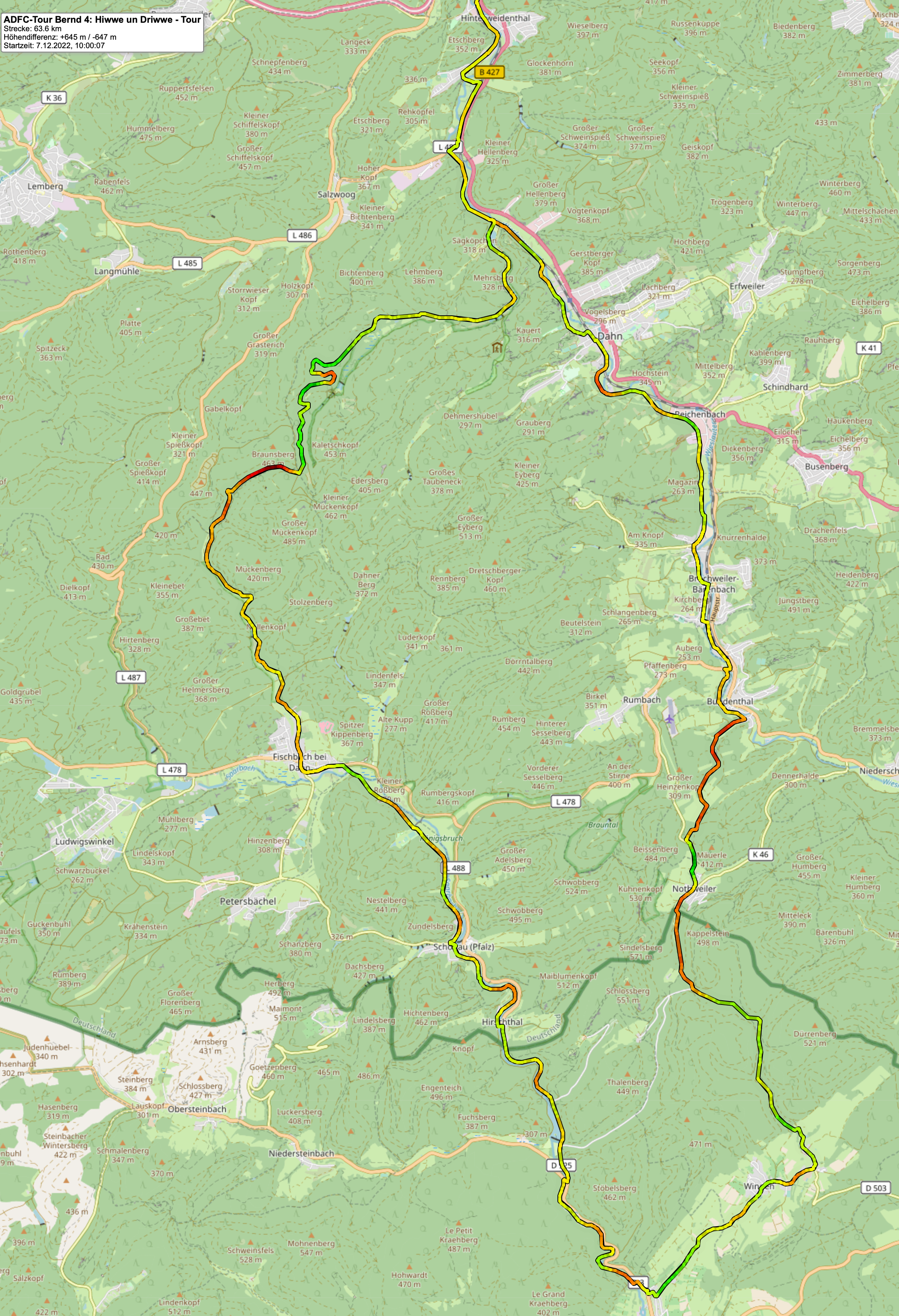 Eigentlich beginnt die Hiwwe un Driwwe Tour viel weiter im Süden und ist auch deutlich kürzer. Wir aber treffen uns bereits in Hinterweidenthal am Bahnhof und fahren zunächst Richtung Dahn. In Bundenbach gönnen wir uns eine kleine Pause, bevor es hinter Nothweiler nach "driwwe" geht. Über Wingen und Lembach führt uns die Strecke zurück nach "Hiwwe". Nach Fischbach geht es dann ins Moosbachtal, bis wir wieder an die Wieslauter kommen und dort die Rückfahrt nach Hinterweidenthal antreten.