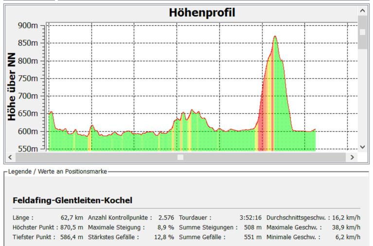 | 62 km | 20 km/h | fester Belag | hügelig | 550 m |